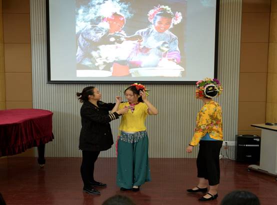 2017年12月27日下午,音乐厅里迎来了五位迈着阿娜多姿的脚步、身着惠安女和浔埔女服饰的美丽姑娘,她们的到来引来了16幼教1、2班同学一片热烈的掌声和长久的赞叹。原来在这里我们请来了2005的校友、泉州舞动空间舞蹈服装租赁店的经理蒋思红,刚才那三位美女就是在她的巧手装扮下,亮相在大伙眼前的。