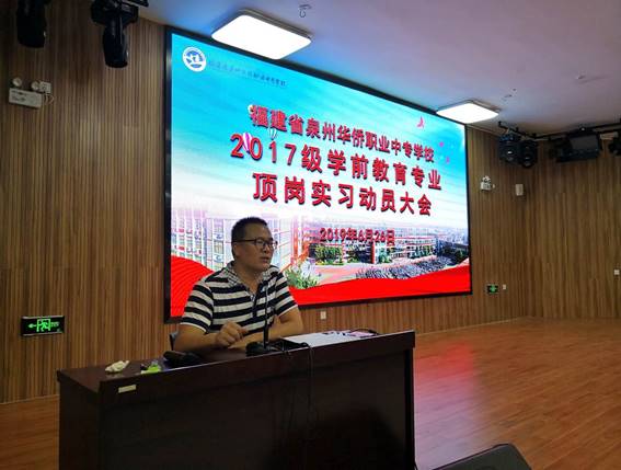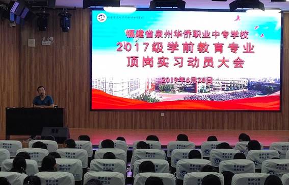 为做好2017级学生的顶岗实习工作,引导学生做好顶岗实习前的各项准备,推进实习顺利开展,6月26日,我校在学术报告厅举行2017级学前教育专业学生顶岗实习动员大会。实训就业处主任赵佳荣老师、学前教育部副主任谢育仪老师、年段长叶琳老师、学前教育专业课老师、各班班主任老师及200余名学生参加了此次大会,会议由谢育仪老师主持。