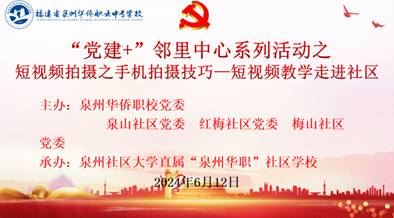 为深化党建引领下的社区治理和邻里互动,推进“党建+”邻里中心建设,2024年6月12日下午,泉州华侨职校电子商务组吴泉艺老师为社区居民开展“党建+”邻里中心系列活动之《短视频拍摄之手机拍摄技巧》短视频教学走进社区讲座。