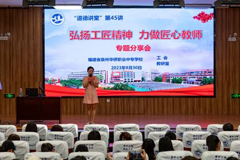 为深入学习宣传贯彻党的二十大精神,深入实施“深学争优、敢为争先、实干争效”的行动,弘扬劳模精神、劳动精神、工匠精神,激励党员、教师的干事创业激情,加强教师立足岗位精益求精、严谨细致的工作作风,以模范榜样激励每一位教师,使每一位教师扎根岗位成长,2023年8月30日福建省泉州华侨职业中专学校工会联合教研室以“弘扬工匠精神 力做匠心教师”为主题开展第45讲道德讲堂。