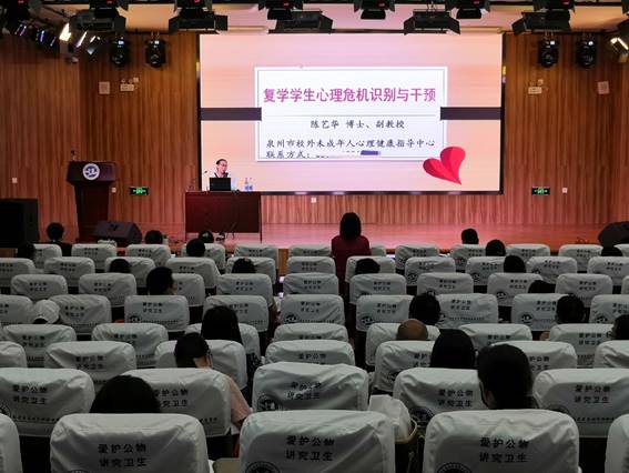 “疫”过天晴,在社会各界人士的坚守和努力下,学校终于迎来了错峰复学。但是经过了漫长的居家学习,学生们可能面临着疫情带来的情绪变化和返校后产生的心理问题。根据上级文件精神,在校领导的高度重视和大力支持下, 5月23日上午,我校霁心园心理辅导与咨询中心邀请心理学博士陈艺华副教授在学术报告厅为全体班主任、段长、德育工作人员、心理援助团队教师100余人举行主题为《复学后学生心理危机识别及处理》的心理健康教育专题讲座,以提升我校广大教职工应对心理危机事件的能力,帮助学生尽快调整好心态,顺利适应复学。