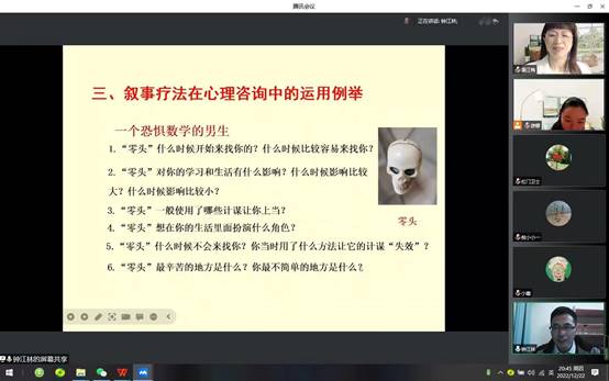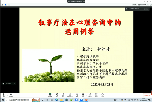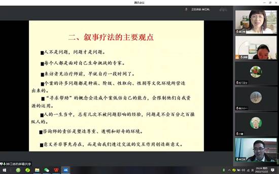 为提高我校专兼职心理教师队伍的专业能力,深入开展学校心理健康教育工作,整体推进心理育人工作,促进学生健康成长,在学校领导的大力支持下,2022年12月22日晚上,我校霁心园心理辅导与咨询中心联合教师发展中心面向心理援助团队的老师安排了一场主题为《叙事疗法在心理咨询中的运用例举》的网络直播心理讲座,特别邀请了心理学高级教师、福建省特级教师钟江林老师为大家分享叙事疗法的主要观点及其运用。