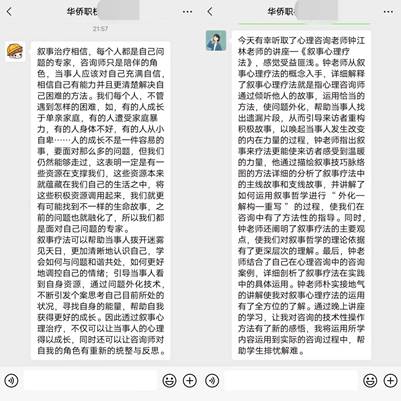 钟老师朴实接地气的讲解使大家对叙事疗法的运用有了全方位的了解,大家受益匪浅,对心理咨询的技术有了新的感悟。通过今晚的学习,在未来的心理咨询中,老师们将尝试运用叙事的哲学温暖陪伴来访者,融合各种心理理论流派,综合运用技巧,建立良好的咨访关系,顺应来访者的问题,引导来访者寻找和重新塑造自己。