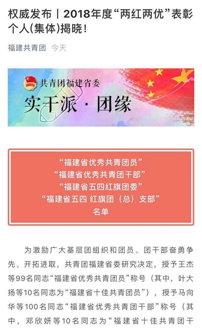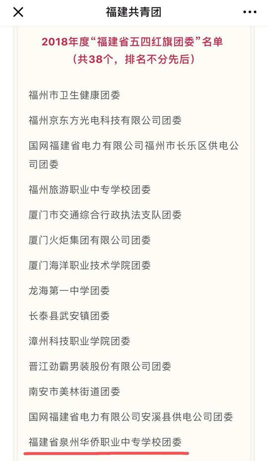 日前,共青团福建省委公布了2018年度“两红两优”表彰个人(集体)名单,泉州华侨职校团委作为泉州市唯一的一所学校上榜“福建省五四红旗团委”,全省仅38个。