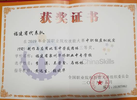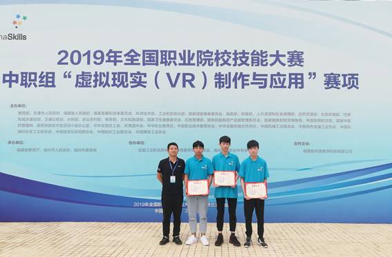 2019年6月12日,2019年全国职业院校技能大赛中职组“虚拟现实(VR)制作与应用”大赛在福建省福州市举行,本次大赛共有来自全国各地的82支代表队、246名选手同场竞技,我校3名选手李涛、吴荣鑫、马林林在黄达生、张晓华两位指导老师的悉心指导下,经历半年的艰苦训练,经过四个小时紧张激烈的角逐,选手们在赛场上发挥稳定,队员之间通力配合,经过不懈努力取得了该赛项的三等奖。