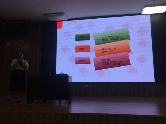 姚春燕刚刚毕业一年多,年纪比在场的学弟学妹并没有大多少,她亲切的给学弟学妹分享了当年学习本专业所获得的知识、荣誉、在公司顶岗实习时所遇到的困难和挑战。仅短短的一年多时间,她已经为公司创造了三百万的营业额。她通过一些详实的案例展示了作为一名从事外贸工作的专业人员,所需要的专业素养要求与语言能力要求。最后,她满怀期许的鼓励学弟学妹们,在最美的年华里,求知探索,一往无前,收获属于自己的精彩!